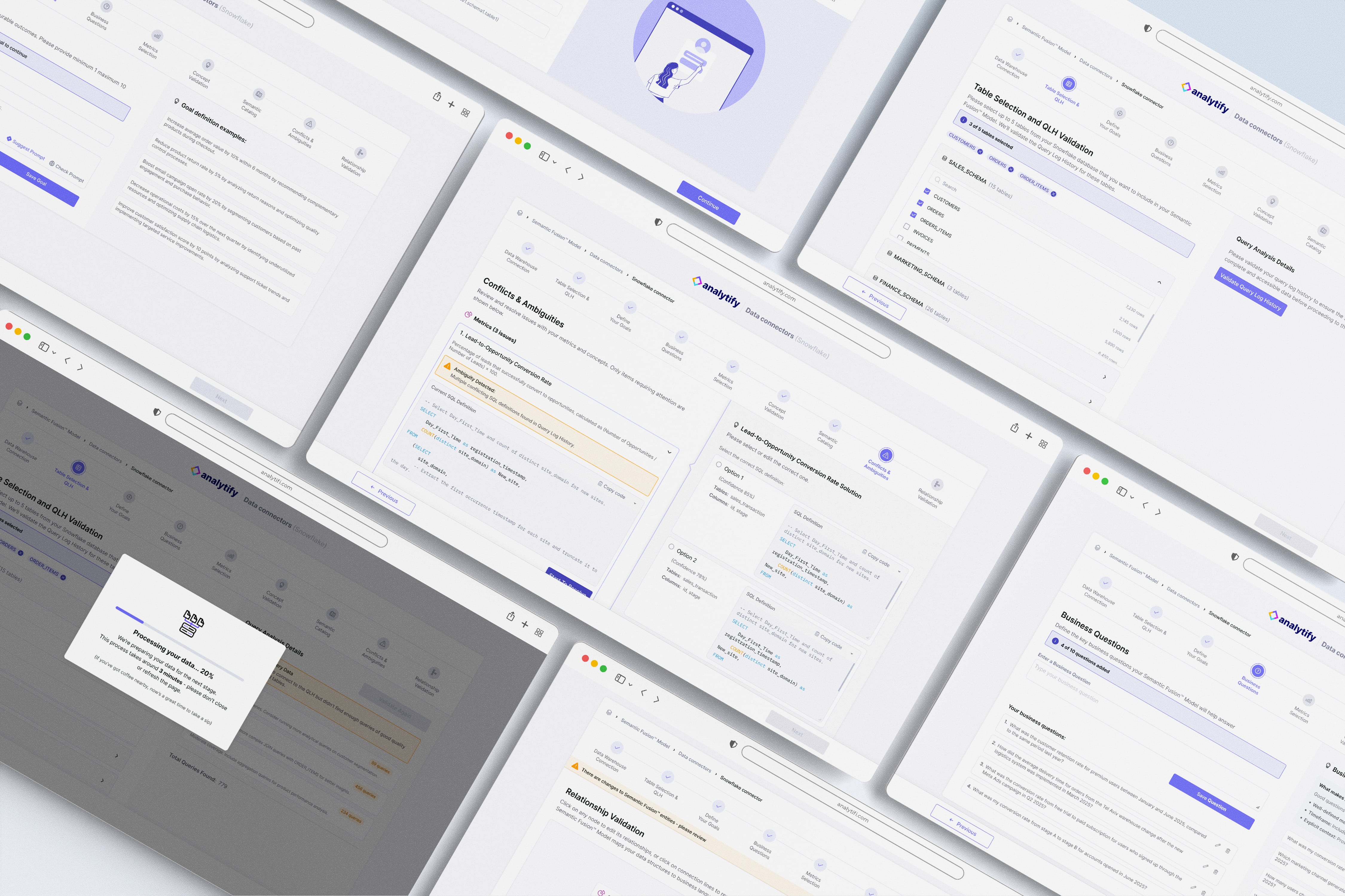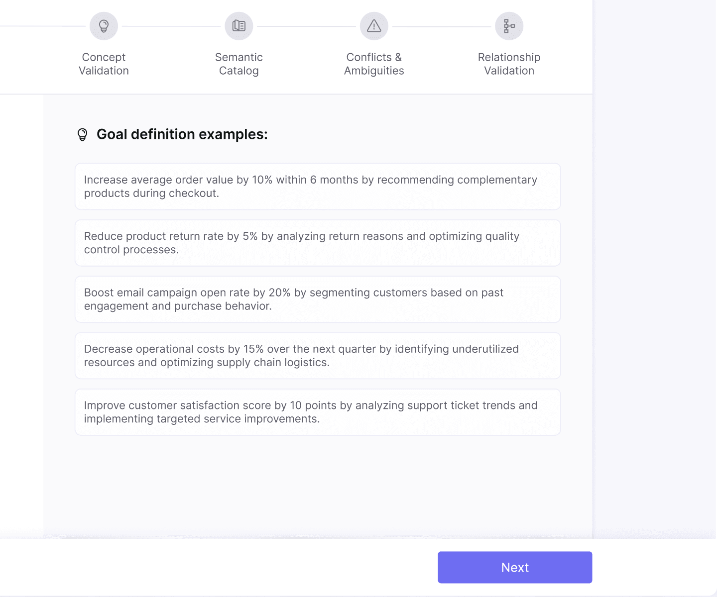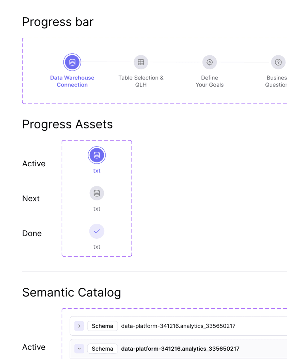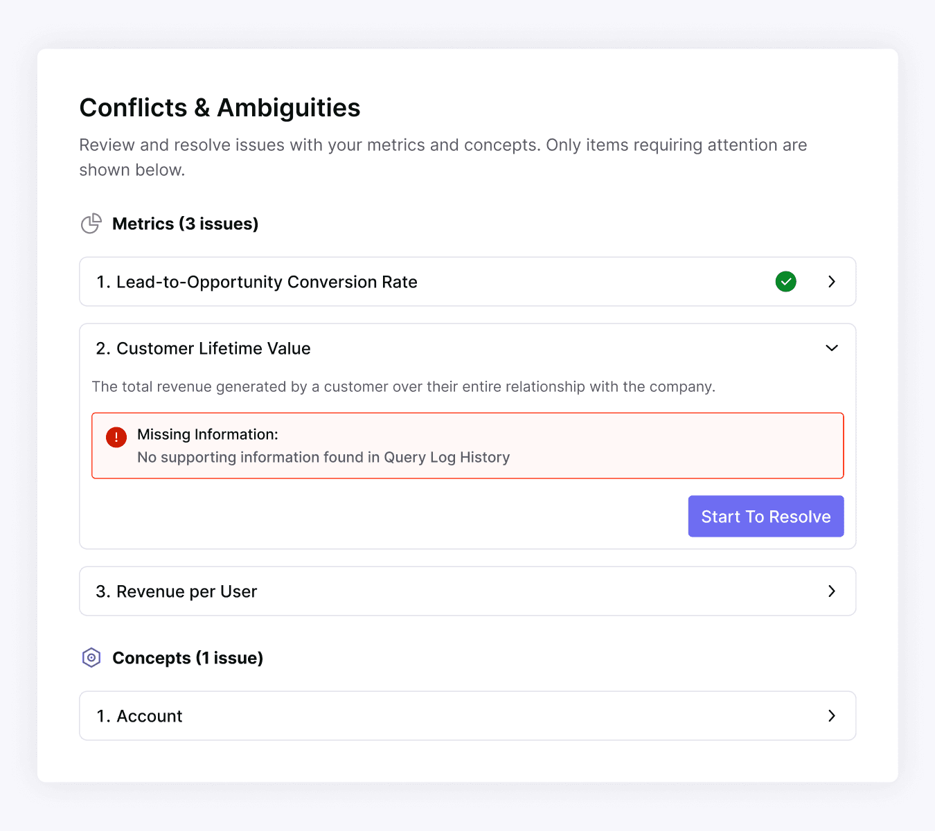 This was defined by the client as the most complex step in the onboarding flow. The system surfaces data conflicts and ambiguities that could impact analysis accuracy, requiring users to actively participate in resolving them - without overwhelming non-technical executive users.