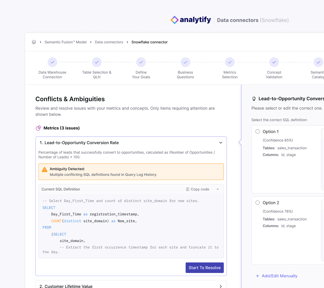 Simplified conflict resolution by grouping issues into clear categories and revealing them progressively. Each issue is addressed individually through a focused resolution flow, combining system-suggested solutions with an optional manual SQL override. Clear resolution states reinforce progress and give users confidence that issues are handled correctly.