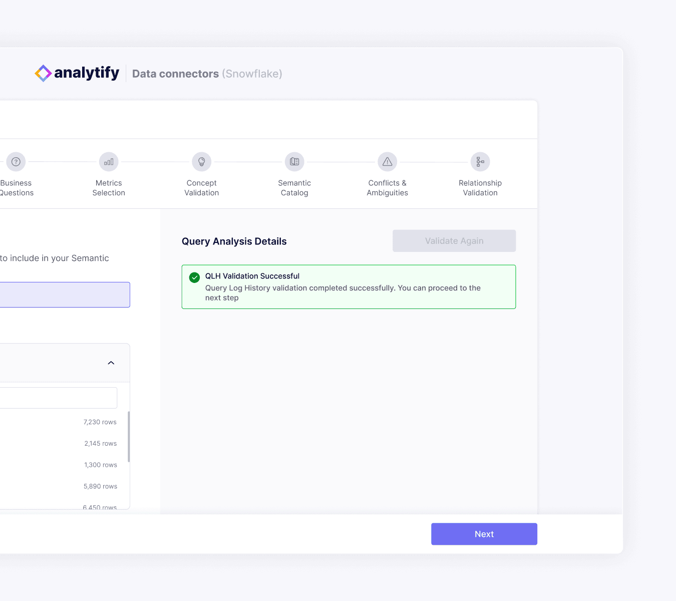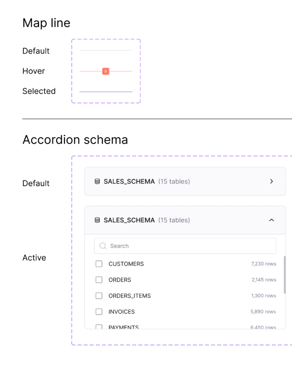 To reduce cognitive load and prevent selection errors, I designed a structured table hierarchy with search and visible selection feedback. Selected tables remain persistently visible and editable, while contextual metadata (table and row counts) supports informed decision-making. A fixed side panel anchors validation actions and error feedback, helping users maintain orientation throughout the step.