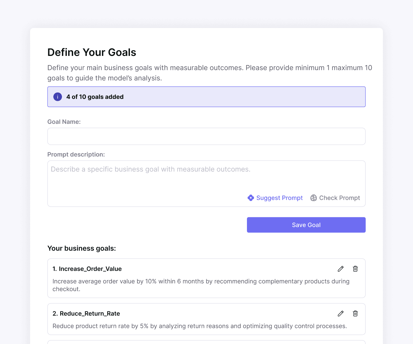 Users needed to formulate goal prompts that directly influence the system’s AI-driven analysis, requiring clarity and precision without overwhelming non-technical users.