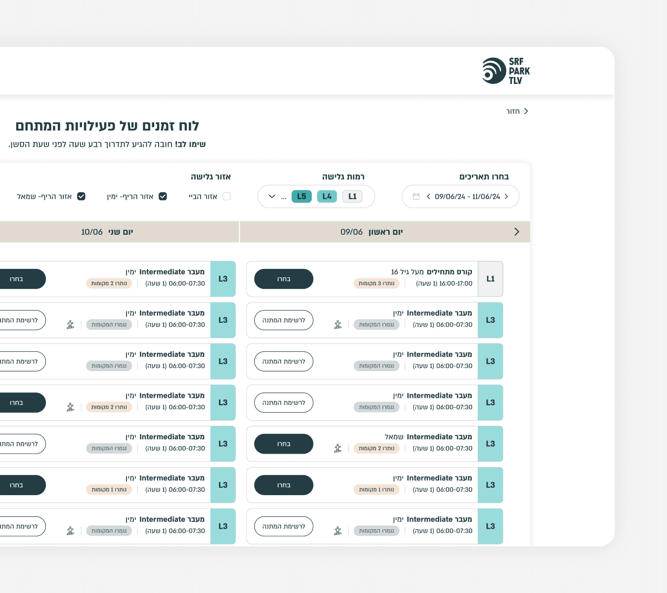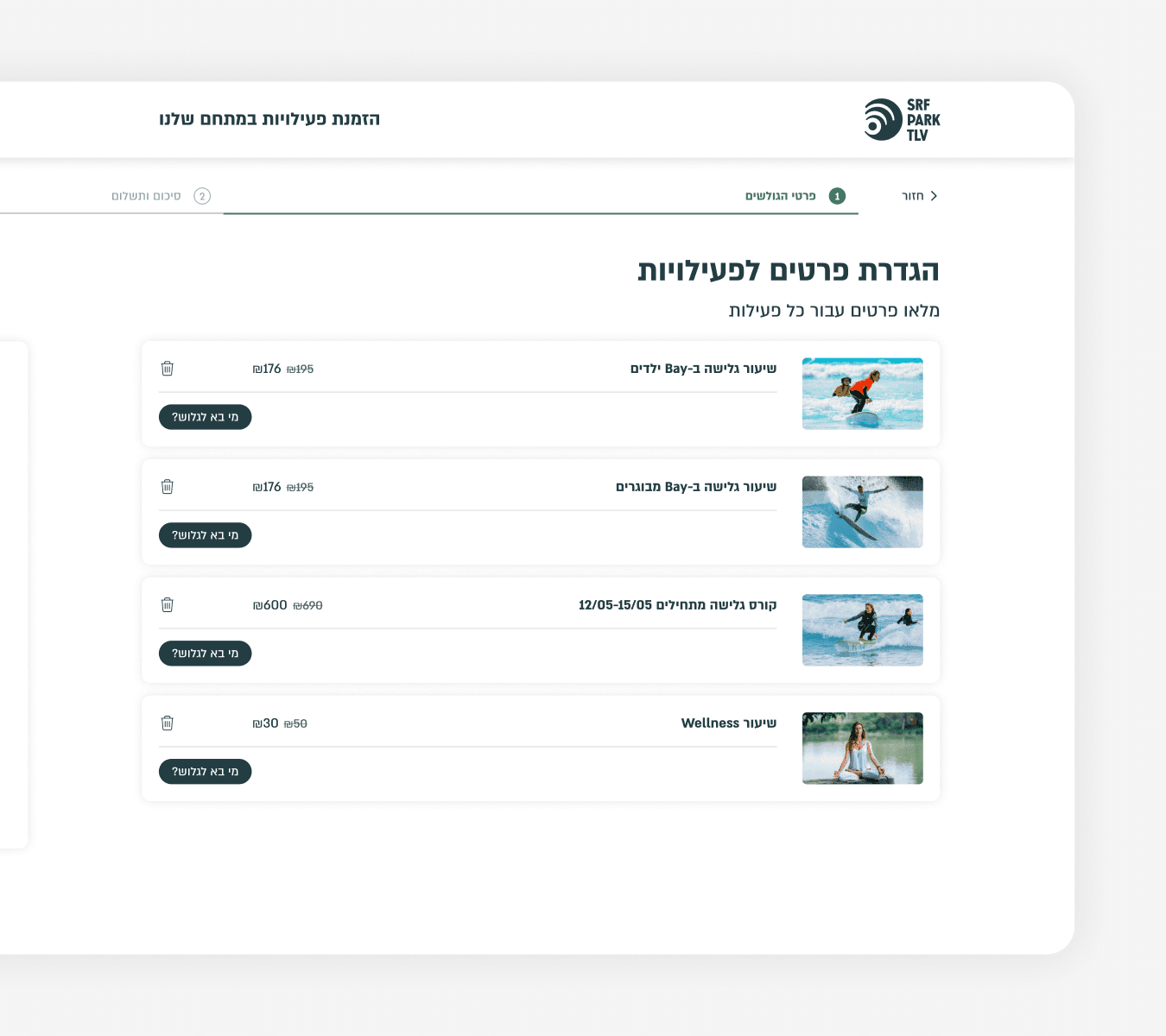 SRF Park TLV is a surf lagoon and lifestyle park in Tel Aviv, supported by a custom-built digital platform. This case study focuses on the design of a flexible, multi-scenario purchase and booking flow, alongside UX work across additional product areas.